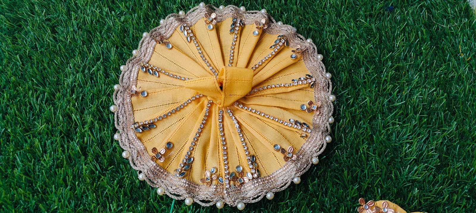 The set includes a matching pagdi, intricately designed to complement the poshak. The pagdi adds a traditional touch and completes the divine look. It is made with the same high-quality yellow silk fabric and features delicate embellishments.