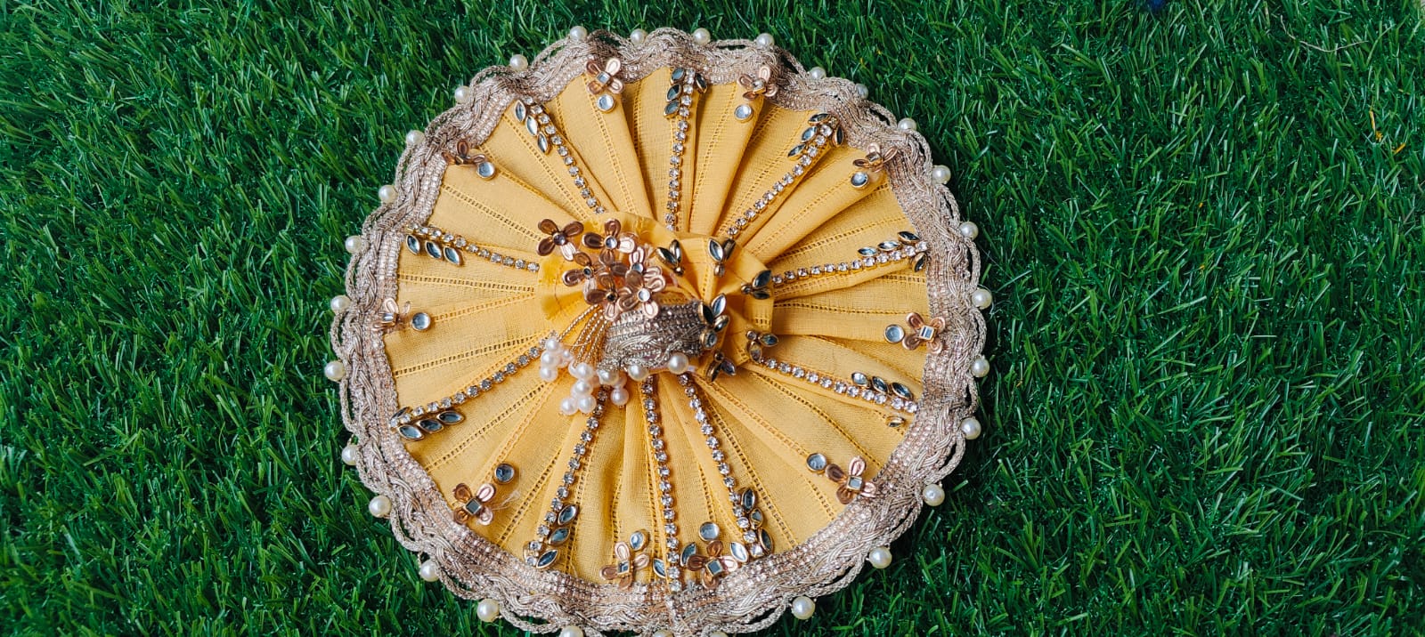 Our Lord Gopal Ji Poshak is meticulously handcrafted by skilled artisans, ensuring every detail is perfect. The vibrant yellow silk fabric not only represents purity and devotion but also adds a regal charm to the overall look.